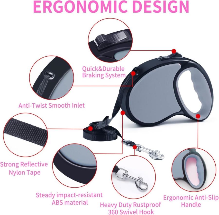 Our Dog Lead is high extendable and reaches 5 meters in length at the max! This is an anti-tangle, nylon leash ribbon with 360-degree movement and allows your pet a high level of freedom whilst making sure they are under your control.