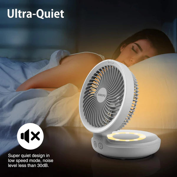 Circulation cooling folding fan, this remote control desk fan with breathing night light is 2 in 1 design for office and home. It provides circulation of the speed throughout the room and regulates the temperature.